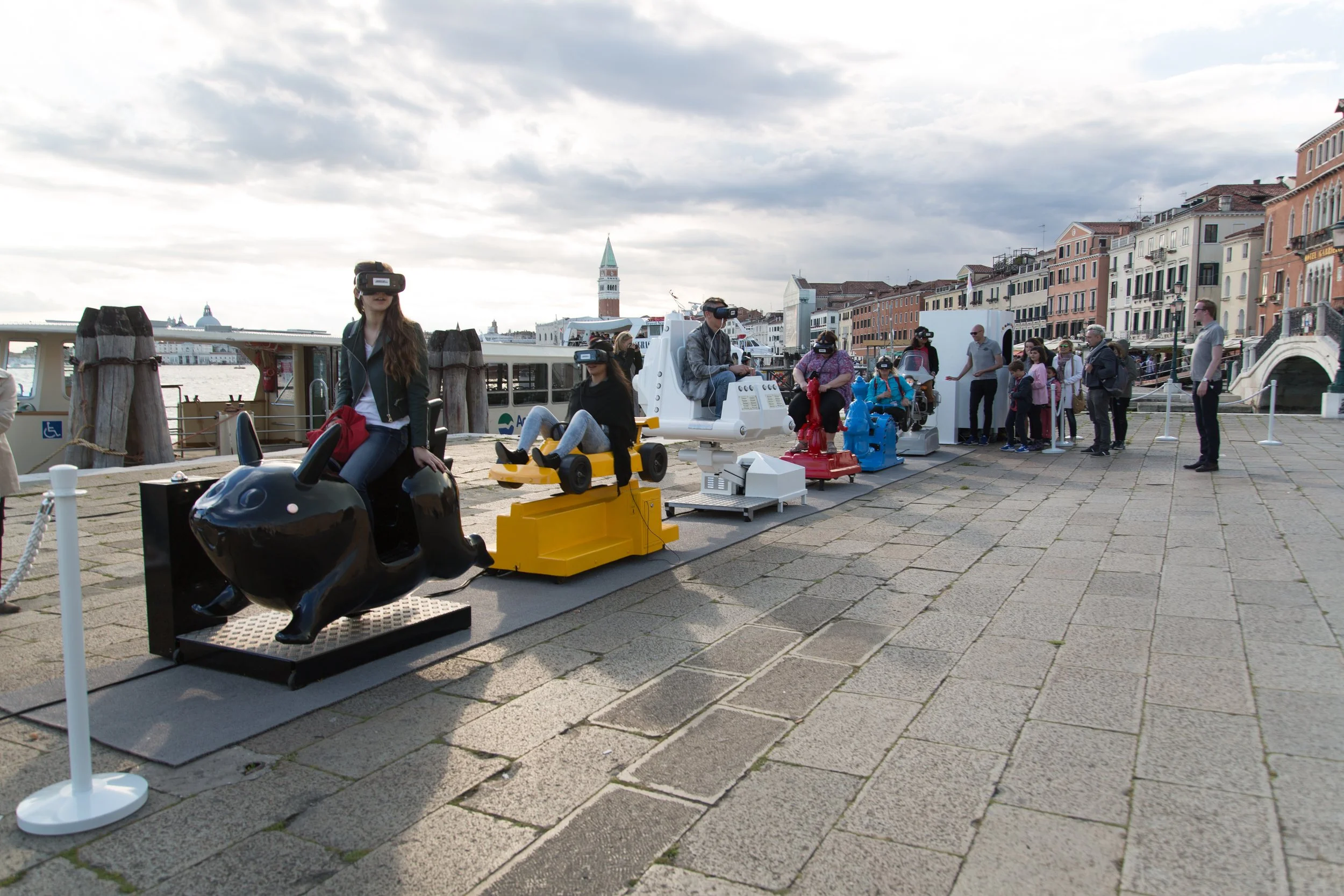 In 2017 hebben we daarom tijdens de Biënnale een guerilla-installatie op de kade bij het San Marcoplein in Venetië gezet. Mensen konden plaatsnemen op speciaal aangepaste kinderattracties en in 2 minuten een VR-rollercoaster ride door de stad maken. Dat sprak een hele diverse groep mensen aan. Kunstliefhebbers, toeristen en zelfs de lokale Venetianen stonden samen in de rij. Precies waar we op hoopten. In de jaren erna hebben we meer kermiskunstinstallaties gemaakt. Toen er tijdens corona geen evenementen waren, kwamen we op het idee een eigen vaste experience te bouwen op Vliegbasis Soesterberg.”