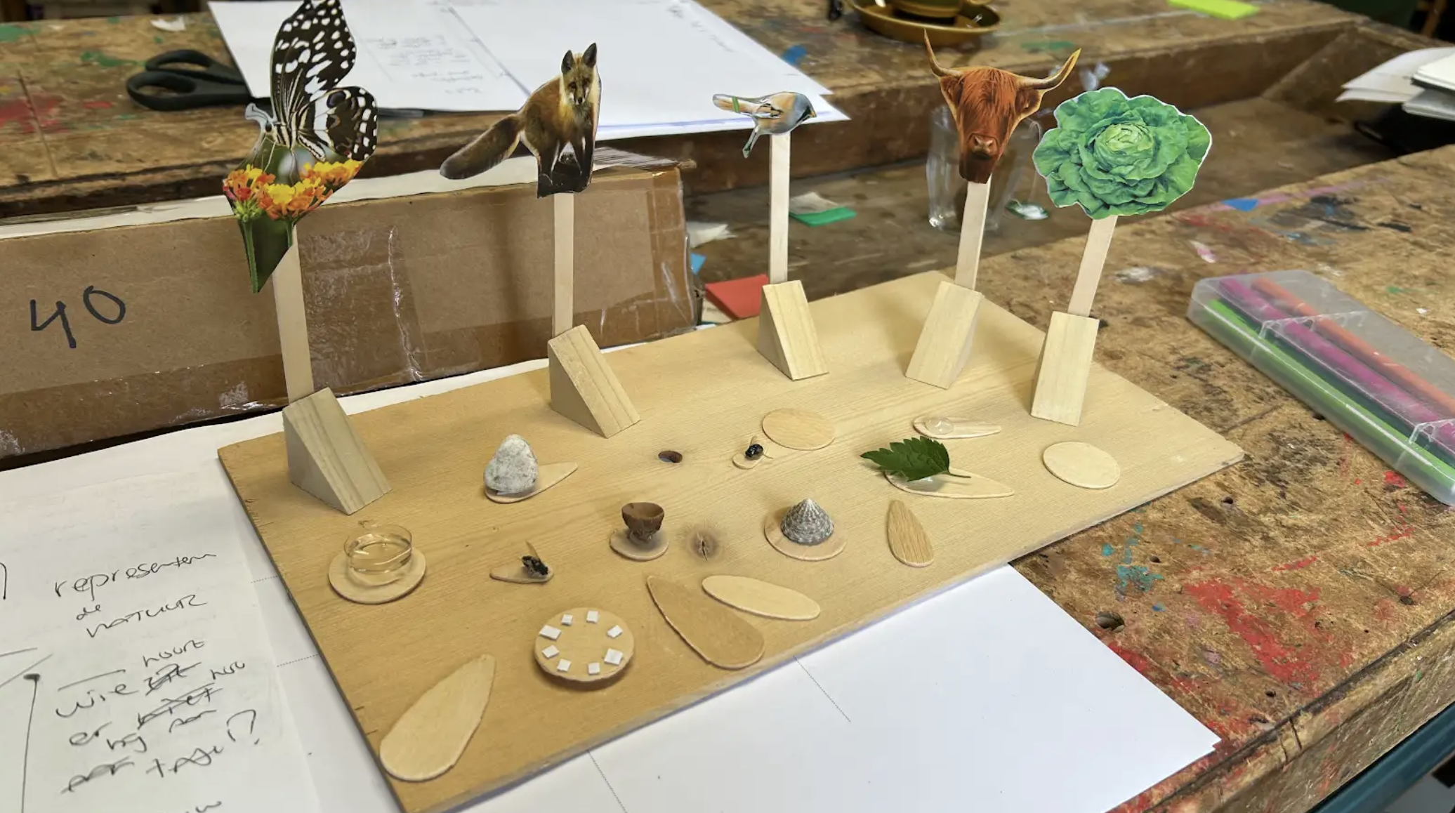 Anne Stoop en Myrthe Mandemakers organiseerden een fictief tafelgesprek om te onderzoeken hoe kunstenaars de natuur vertegenwoordigen. Hun miniatuur-opstelling riep nieuwe vragen op over besluitvormingsprocessen van bedrijven en instellingen over duurzaamheidsvraagstukken.